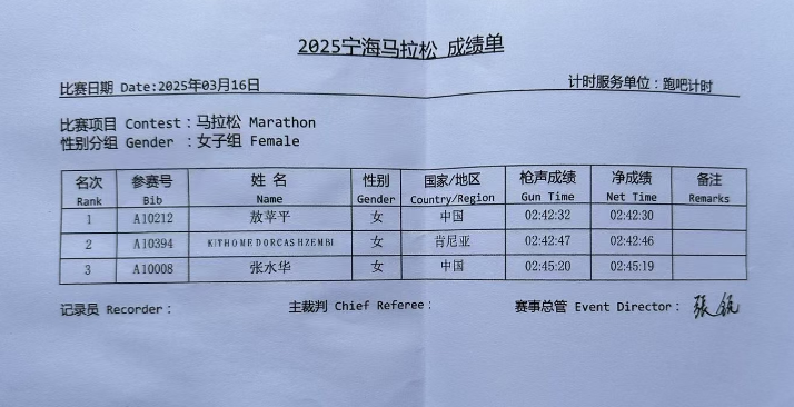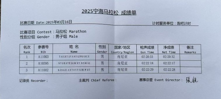 经过激烈的争夺,最终2025宁海马拉松男子马拉松项目组的前三名分别归属于TAIGET EVANS KIPKORIR(肯尼亚)、NYOKAYE SAMMY DISMAS(肯尼亚)和KOSGEI ANTONY KIBIWOT(肯尼亚),女子马拉松项目前三名则分别是敖苹平(中国)、KITHOME DORCAS HZEMBI(肯尼亚)和张水华(中国)。