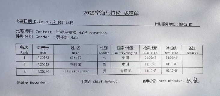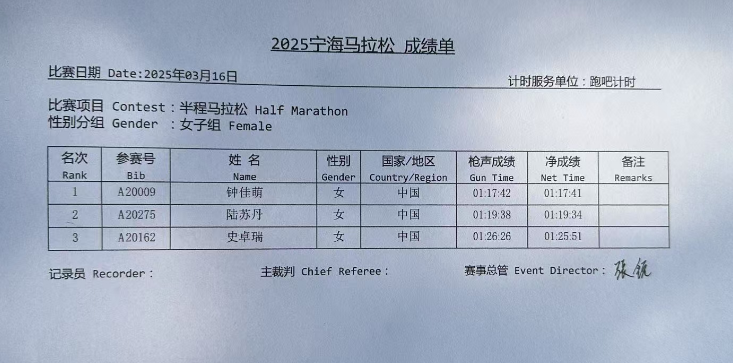 2025宁海马拉松半程马拉松项目组的冠军成绩如下:
