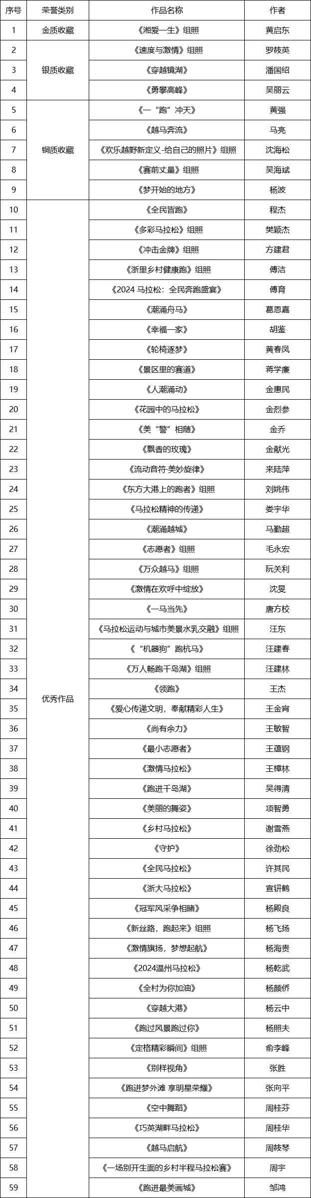 由浙江省马拉松及路跑协会、浙江省摄影家协会共同主办的2024年度浙江省马拉松摄影大赛的评选工作已经结束。本次大赛共收到近500位投稿者的4900余幅(组)马拉松及路跑赛事的作品。根据征稿启事相关规定,本着公平、公正、公开原则,现将本次大赛全部拟入选作品予以公示。公示期为2025年3月26日至4月2日24:00。