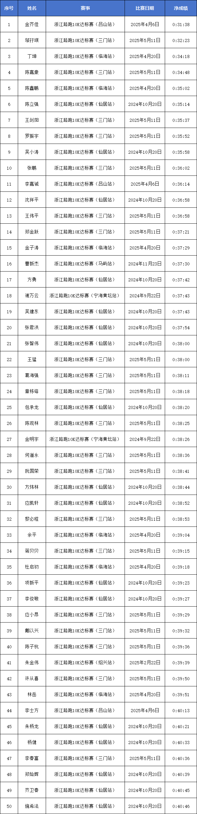台州市|2024-2025赛季浙江马拉松积分赛男女子全马与半马前100名名单公示